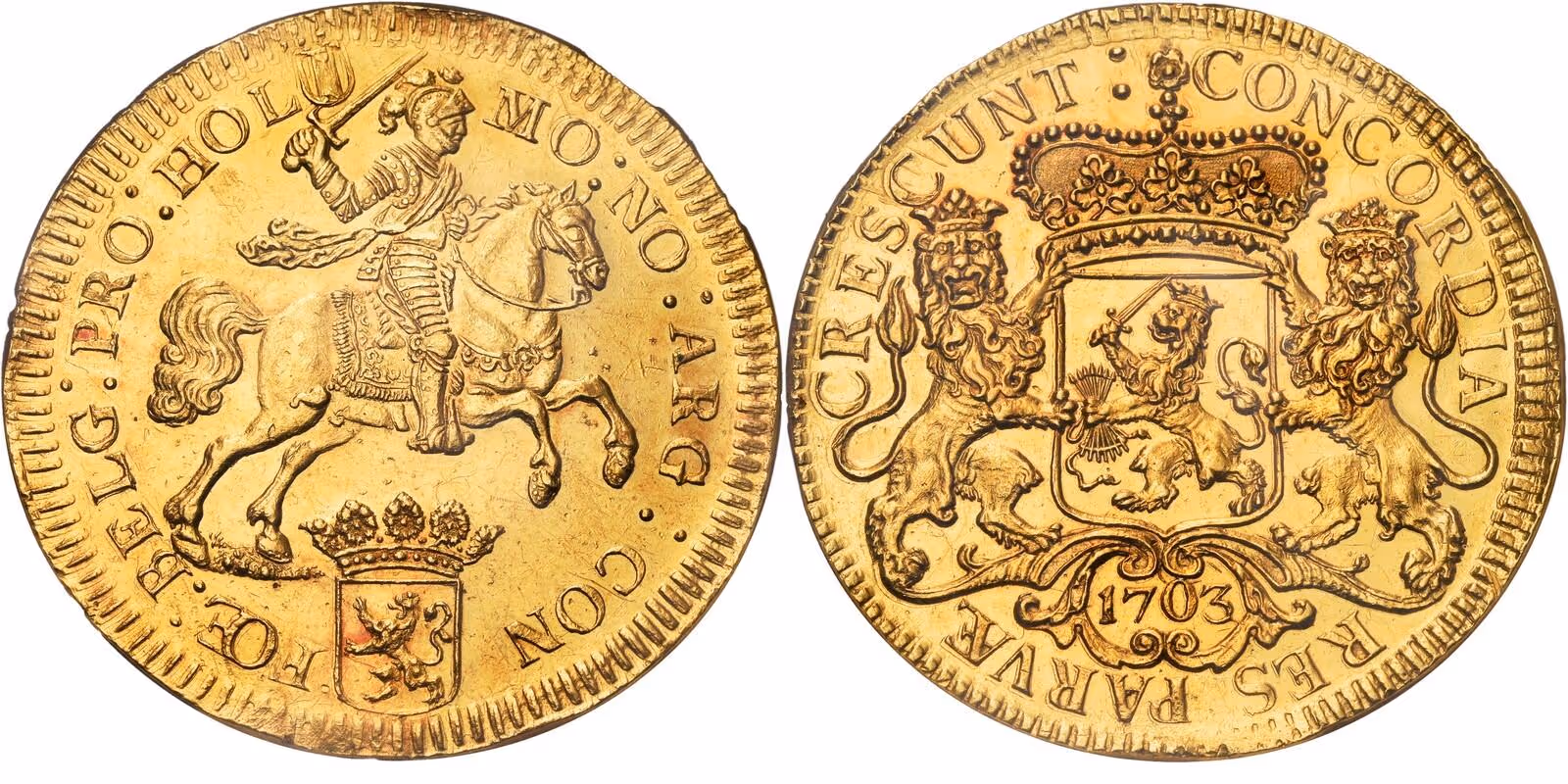 Een uitzonderlijke provinciale uitgifte gebaseerd op de zilveren rijder (dukaton). Dergelijke grootgouden stukken behoren tot het absolute topsegment van de Republiek der Verenigde Nederlanden en zijn van grote betekenis voor de studie van provinciale munten.