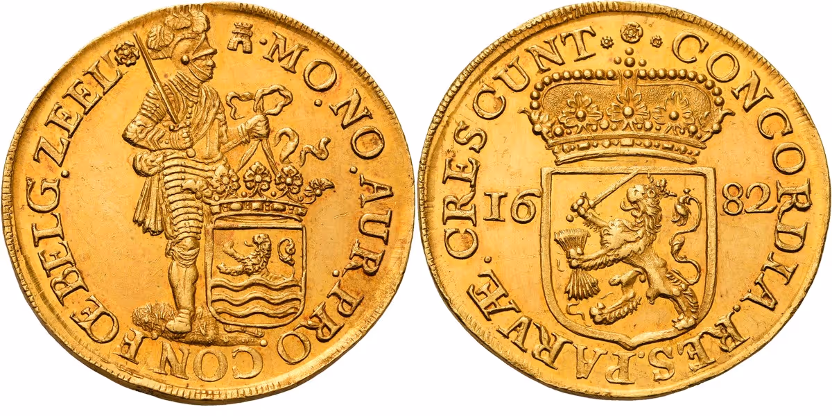 Een uitzonderlijk ontwerpstuk, geslagen op het gewicht van tien dukaten. De combinatie van ontwerp, formaat en herkomst plaatst dit object in het hoogste segment van het Zeeuwse muntwezen.