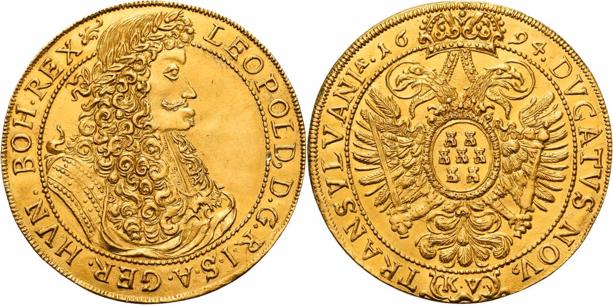 Een uiterst zeldzaam meervoudig dukatenstuk uit Midden Europa. De krachtige barokke portrettering en de scherp geslagen keizerlijke adelaar maken dit tot een internationaal gewaardeerd verzamelobject.